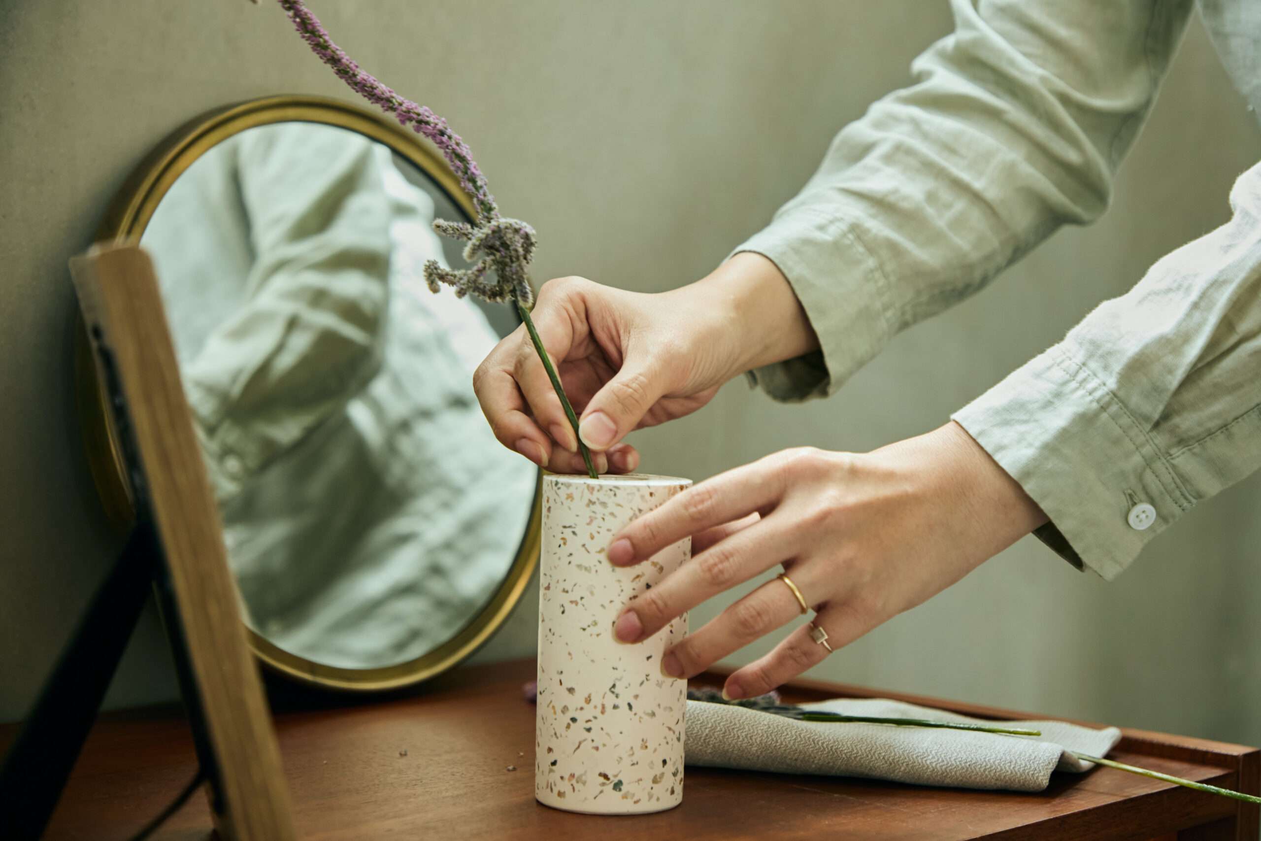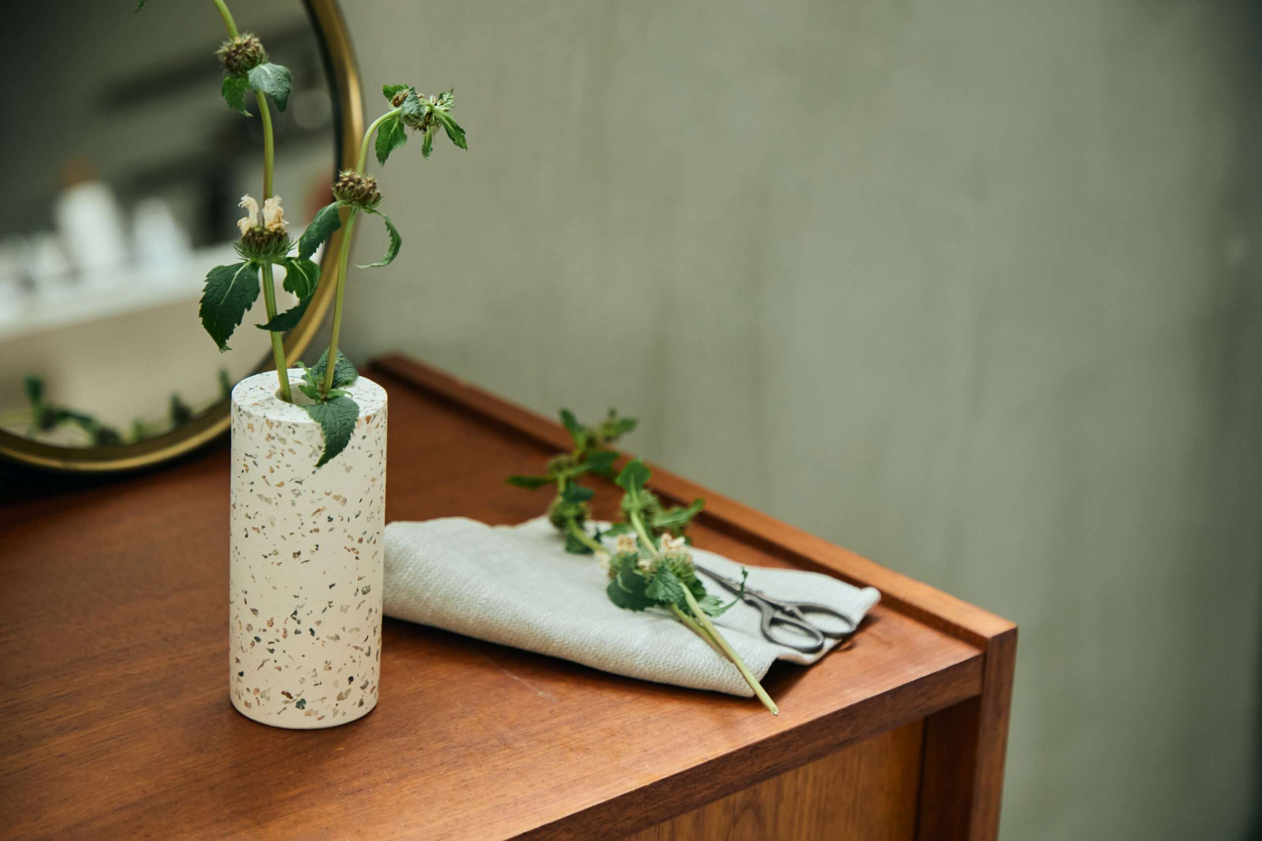 色のニュアンスが可愛い<soil>フラワーベースは、珪藻土で作られた質感がお部屋のアクセントに。石そのものの風合いが豊かに表現されたデザインは、どのお部屋にも似合います。一輪でも映えるので、散歩の途中で見つけたお花を飾るだけでも、幸せな気持ちになれそうです。