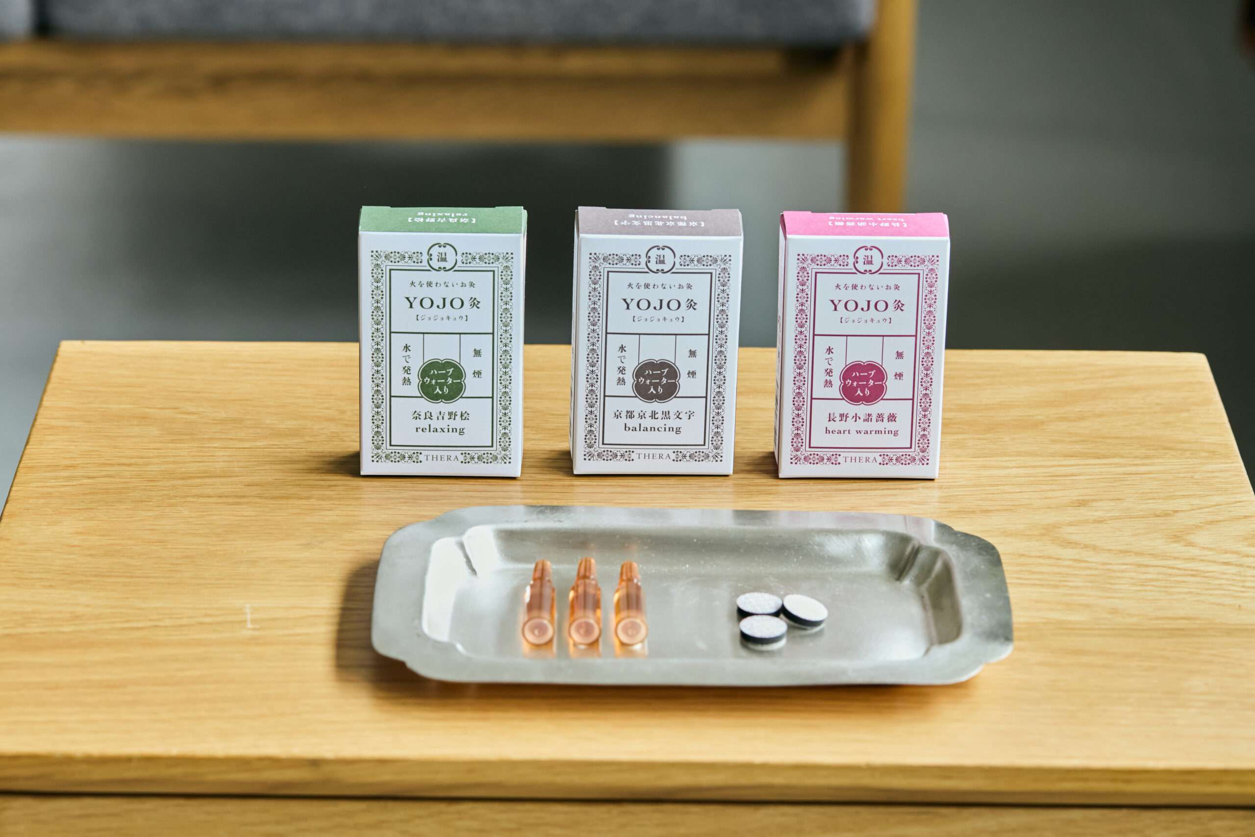 THERAのアイテムは日本古来の香りにこだわったものが多く、日々にほんのひととき、立ち止まる瞬間を生み出してくれます。アロマ水で焚くお灸、YOJO灸もそのひとつ。やわらかな香りのアロマ水にお灸を浸すと、じんわりと温まる不思議なお灸です。お灸は火が怖いな…という方でも使いやすく、心地よい温熱刺激がツボを程よく刺激してくれます。仕事や家事の合間に使いやすいところもポイントです。