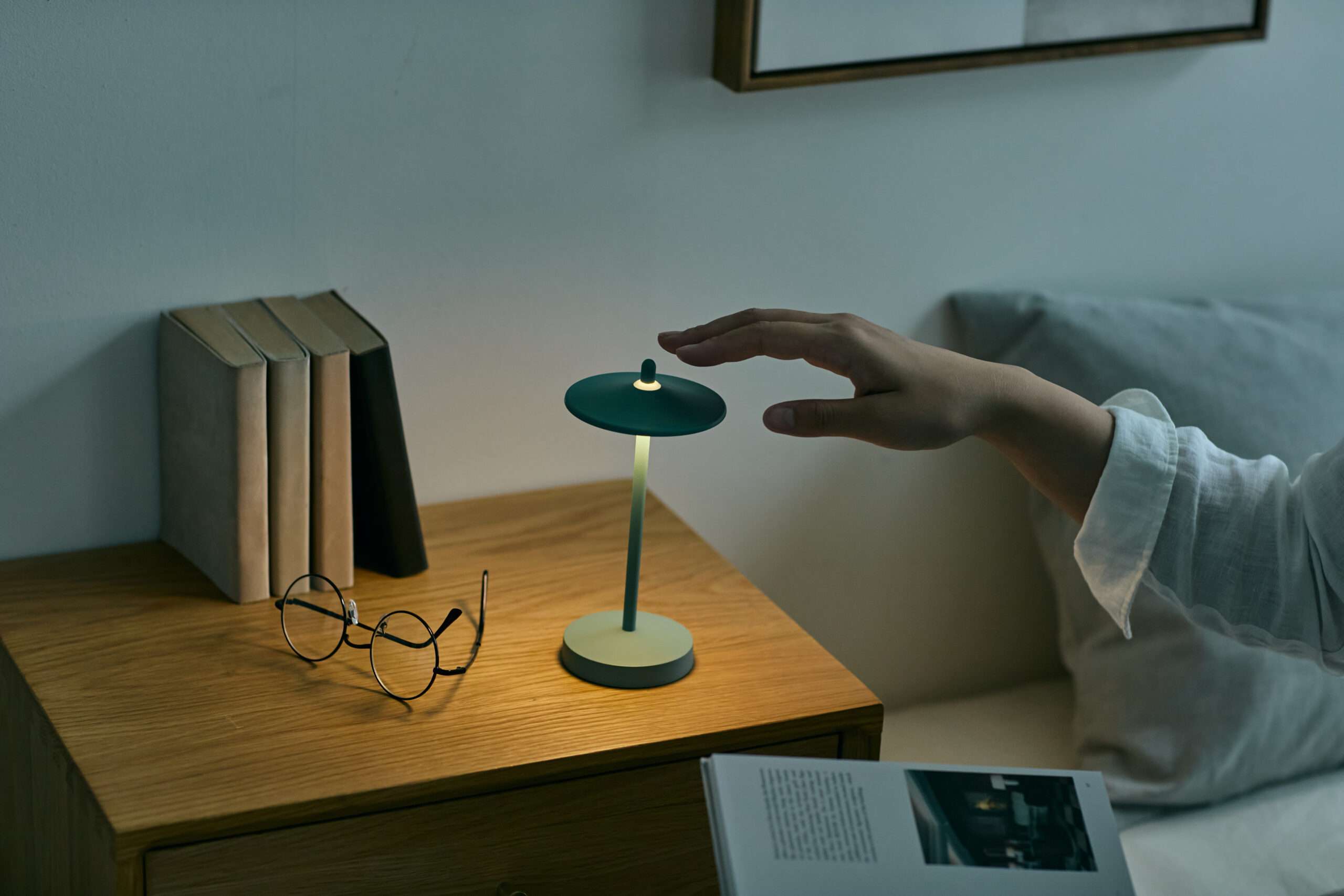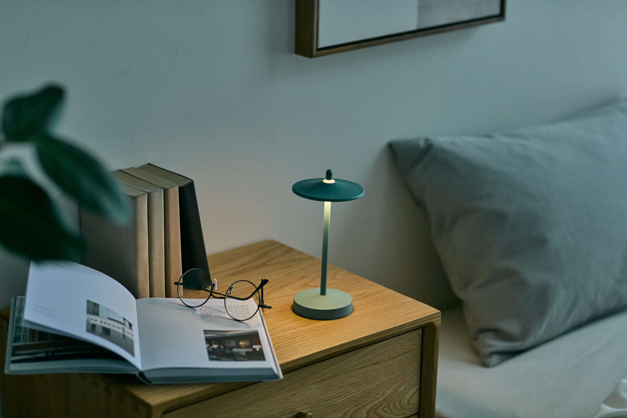 また、灯りも大切で、目から光が入るとなかなか寝付けないものです。ベッドサイドに取り入れたい<ディ クラッセ>Pala portable lampは、ほのかな光が、空間と心にやさしく照らすポータブルランプ。コードレスで自由に持ち運べて、手元や足元をやわらかに照らします。上部に触れるだけで簡単にON/OFFができ、長押しで好みの明るさに調整できる機能も魅力です。