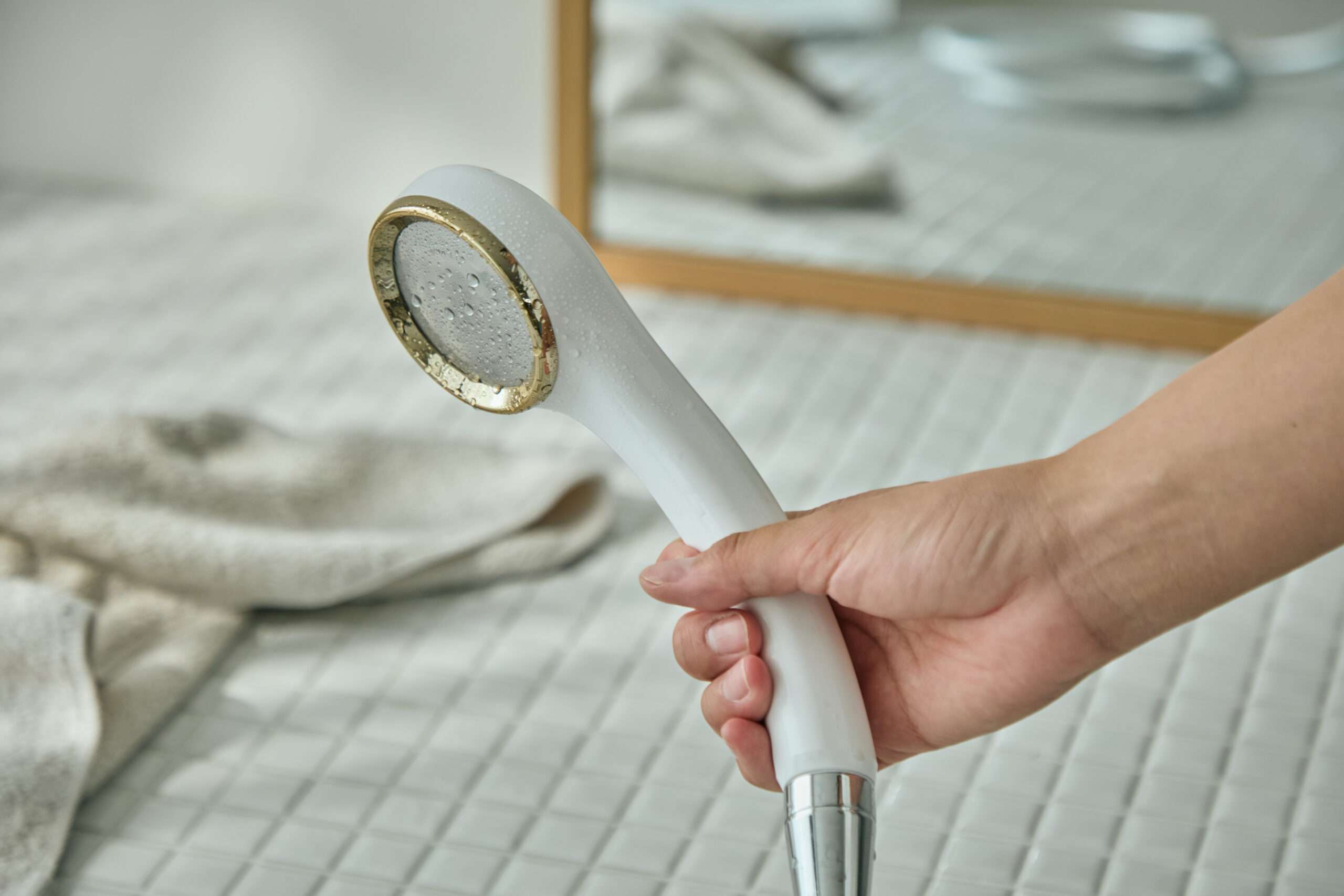 <サンエイ>シャワーヘッド マトイは、節水重視タイプでありながら、“浴び心地”まで追求されたアイテムです。肌あたりは痛くないのに、きめ細かいシャワーで泡を一気に洗い流せると人気です。ホワイト×ゴールドのデザインも上品で、お風呂まわりの雑貨と相性よく馴染みます。