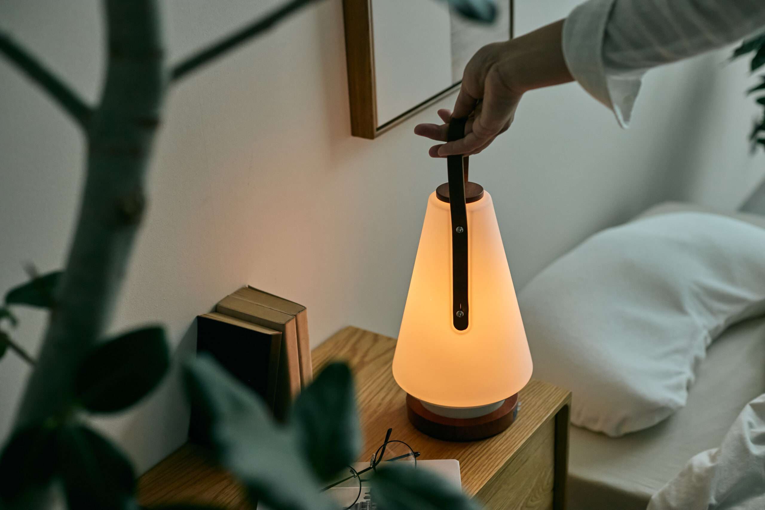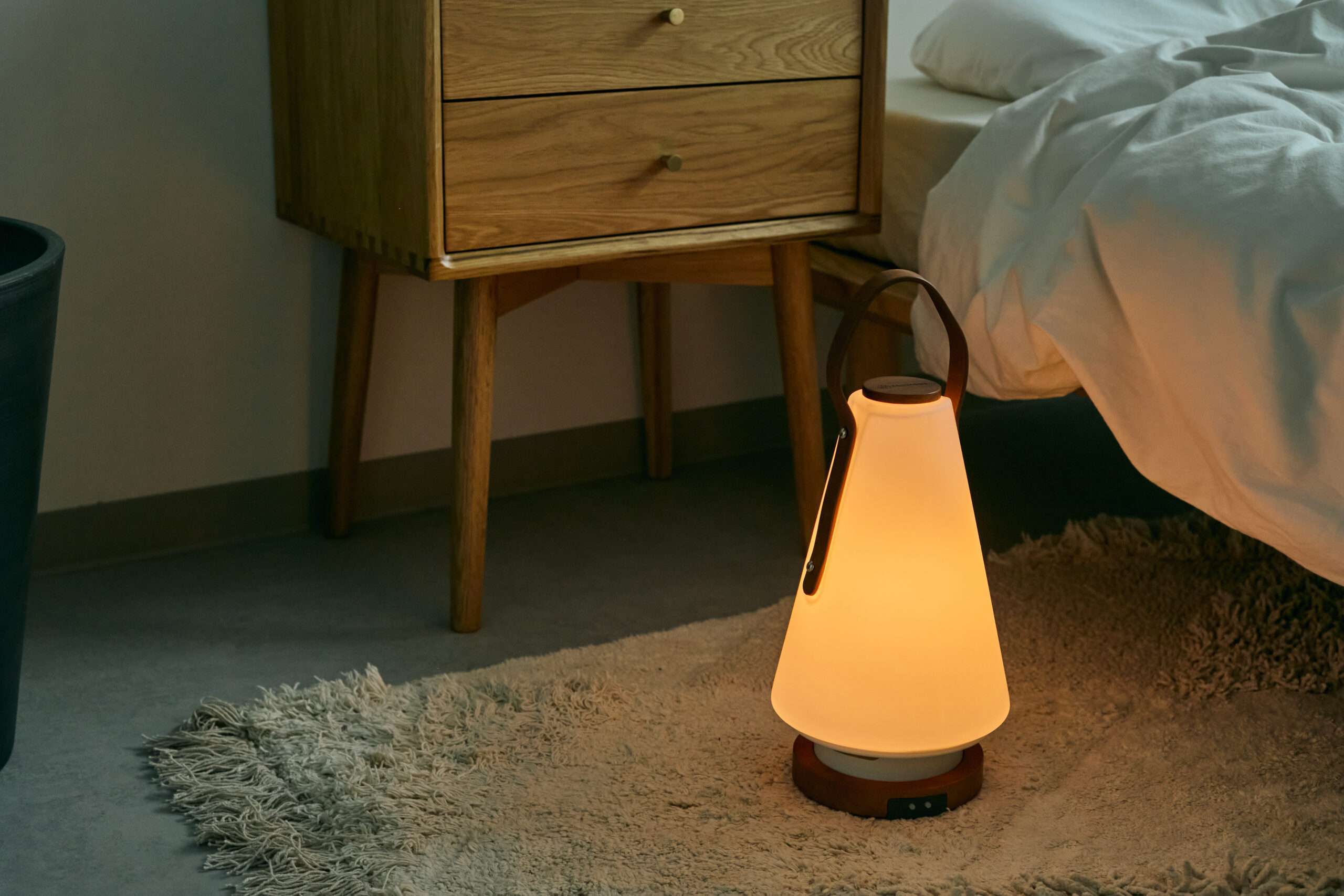 そんな寝室におすすめしたいのが、<モリモリ>LEDランタンスピーカールームスです。やわらかく灯るランタン型の照明と、Bluetoothスピーカーが一体となったアイテムで、キャンドルのような明かりとともに、好きな音楽がそっと気持ちをほぐしてくれます。持ち手の本革や土台の天然木など、こだわりのあるデザインも素敵です。