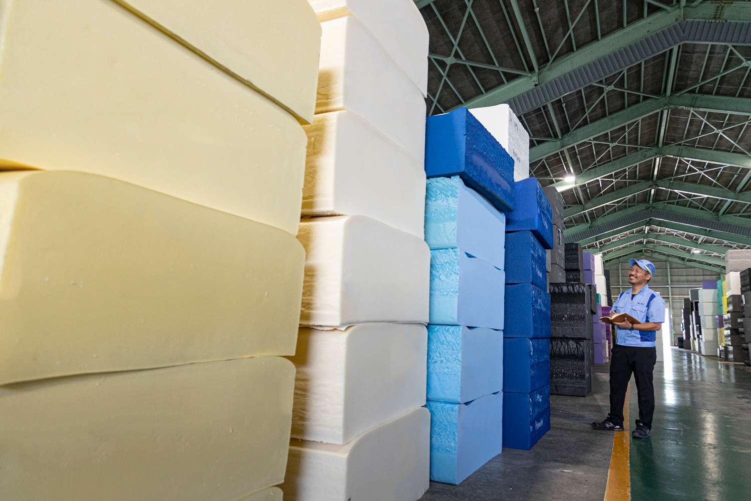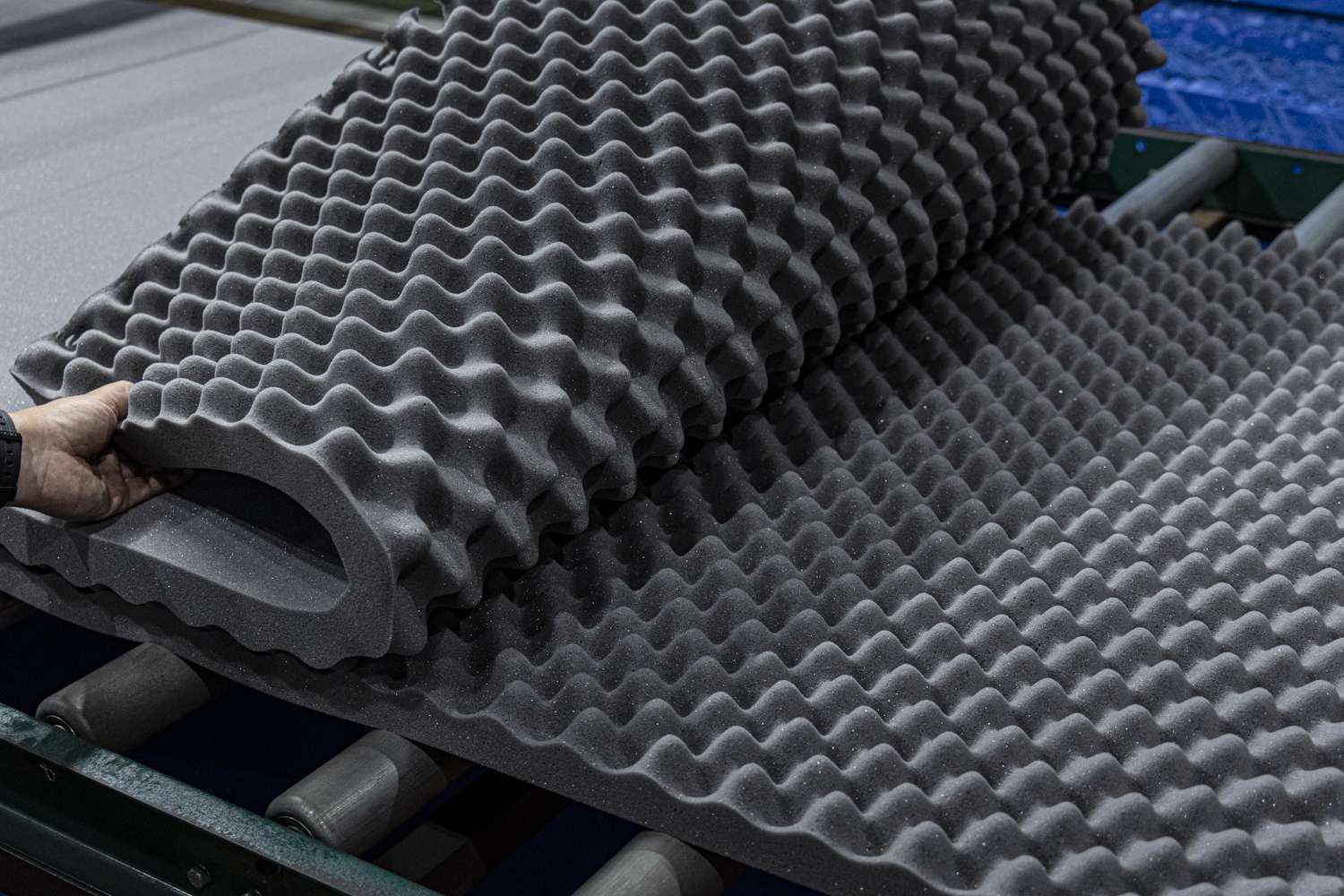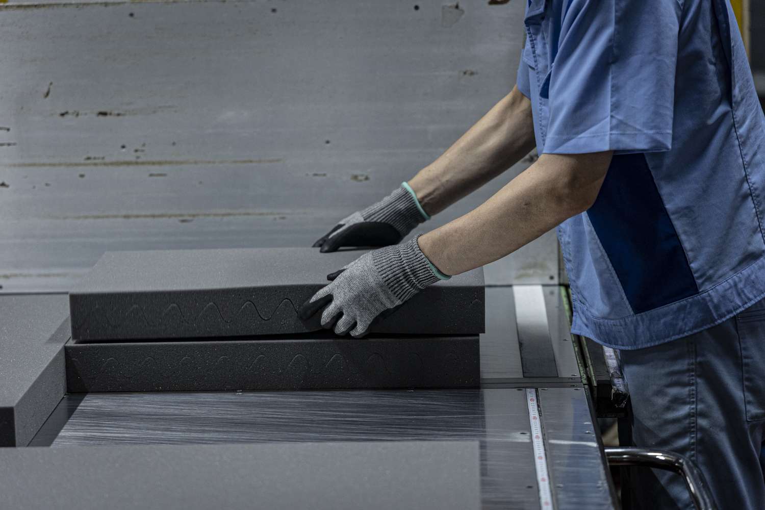 最新と最古の発泡機械が共存する工場。凹凸を作る専用のムアツ加工で1枚のウレタンをまたたくまにカット。