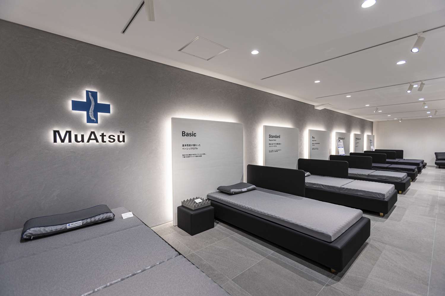〈ムアツ〉のまくらとマットレスを体験できるショールーム。実際に横になると凹凸が全く気にならないことがわかります。